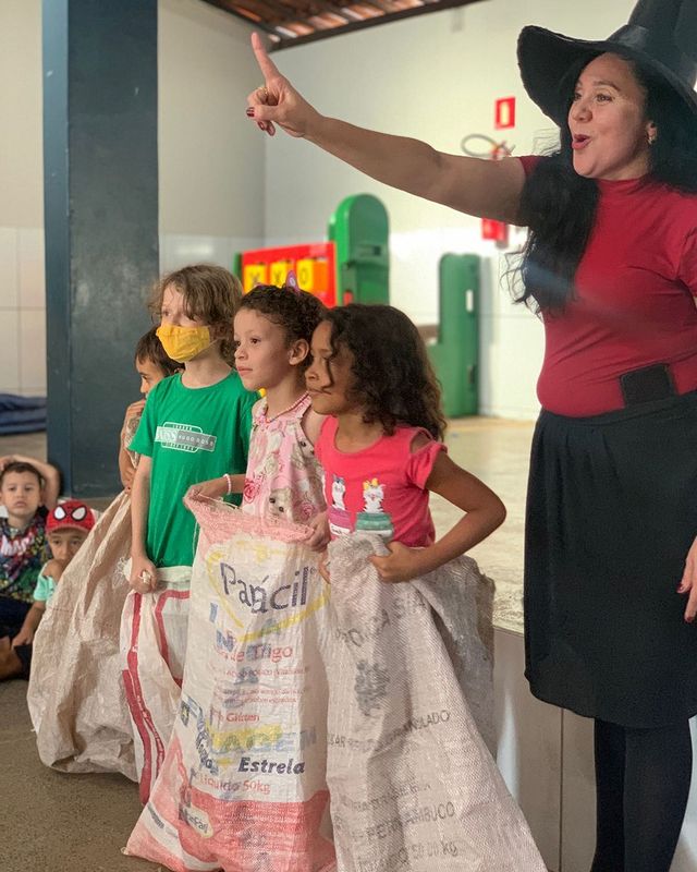 sacos, estoura balão, boliche etc, além da entrega de sacolinhas com pipocas, bombons, pirulitos e a entrega dos brinquedos.